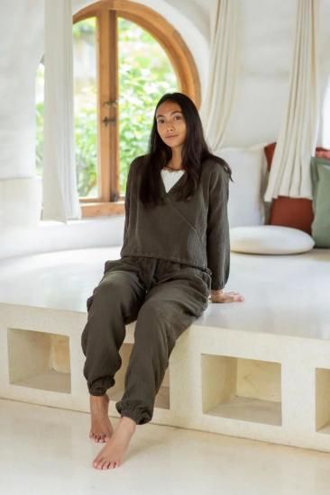 Color/スミイロ Size/Free- 着丈(肩から)52cm、バスト60cm、袖丈45cm、裾幅52cm 素材/コットン 100% (ダブルガーゼ) 赤ちゃんのおくるみにも使われる、やさしいガーゼ素材のトップス。 前はカシュクール風のデザインですが、縫い合わせてあるので着脱はとても簡単。トレーナーのように気軽に着回せます。 袖口はゴム入りで、作業のときにさっと袖をまくれて便利。 少し短めの裾丈は、どんなボトムスとも相性よくまとまります。 裾まわりには紐がぐるりと通っていて、絞ることでまた違った表情を楽しめる一枚です。ボトムスのガーゼより薄い素材です。 *indigo seaでは染めから色止めまですべてナチュラル素材を使用していますので、 一般的な化学染料で染められた製品に比べて洗濯や日光に弱く、使用を重ねるとともに、色が変化します。 自然な色落ちは草木染めならではの風合いとご理解いただき、その変化もまるごとおたのしみください。 3回目までは特に色落ちしやすいため、裏返して水で手洗いしてください。 *店頭販売も行っている為、在庫切れの場合がございます。 *★マークが付いている商品は在庫切れとなっております。 お取り寄せをご希望の場合、通常通りカートに入れてお進みください。 最近チェックした商品