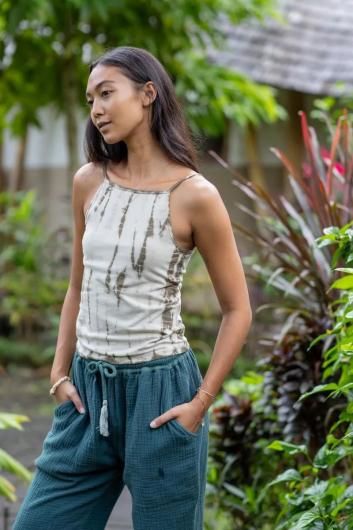 Color/1.ホワイトイカット、2.ベージュイカット Size/Free- 総丈48cm、バスト68〜cm、裾幅37cm 素材/オーガニックコットン 90%、ポリウレタン 10% オーガニック草木染めのキャミソール、2025年秋冬はこちらの型で登場です。 直接肌に触れるからこそ叶えた、極上のやさしい着心地。 胸カップポケット付きで、これ一枚でブラ代わりとしてもご利用いただけます。 ネックラインが高めのデザインなので、これからの季節の重ね着にも映え、草木染めの色合いがさりげなく表情を添えてくれます。 胸元がカバーされている分、定番キャミソールよりも暖かく、秋冬に心地よく寄り添う一枚です。 インナーまで草木染めの色を取り入れた、トータルコーディネートをお楽しみください。 肩紐は長さ調整可能、伸縮性もあり。カップはご自身でご用意ください。 *indigo seaでは染めから色止めまですべてナチュラル素材を使用していますので、 一般的な化学染料で染められた製品に比べて洗濯や日光に弱く、使用を重ねるとともに、色が変化します。 自然な色落ちは草木染めならではの風合いとご理解いただき、その変化もまるごとおたのしみください。 3回目までは特に色落ちしやすいため、裏返して水で手洗いしてください。 *店頭販売も行っている為、在庫切れの場合がございます。 *★マークが付いている商品は在庫切れとなっております。 お取り寄せをご希望の場合、通常通りカートに入れてお進みください。 最近チェックした商品