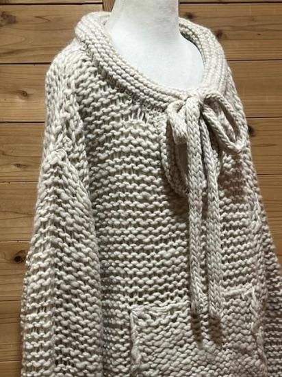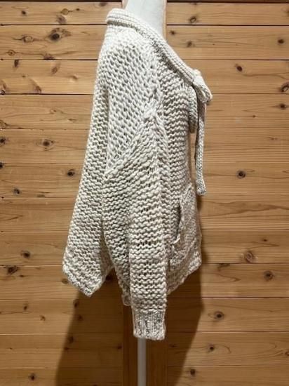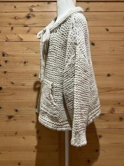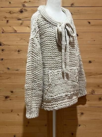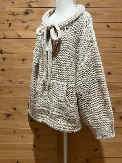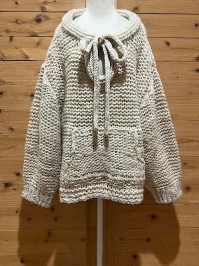 前シーズンに引き続き丸あみのドロストを使い甘く編んだプルオーバー。パーカーライクなデザインが特徴です。